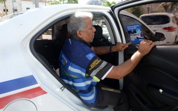 Agentes da Semob distribuem adesivos com informações sobre táxis em Salvador