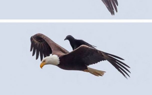 Fotógrafo captura belo momento em que um corvo resolve pegar carona nas costas de uma águia